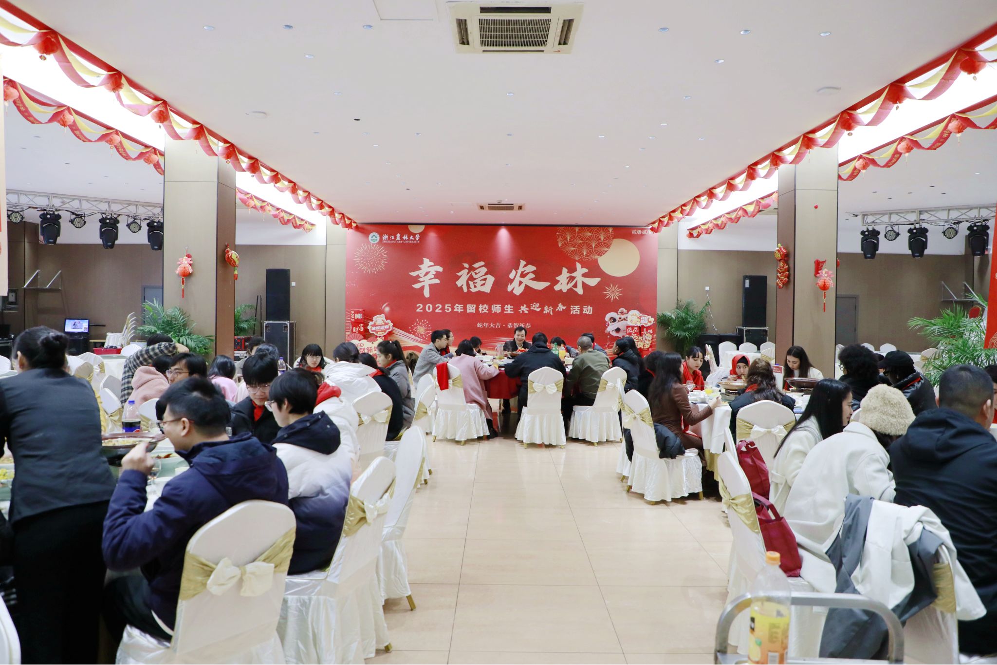 在西徑食堂,學(xué)校精心為留校師生準(zhǔn)備了豐盛的年夜飯。食堂內(nèi)張燈結(jié)彩,洋溢著濃濃的年味。校領(lǐng)導(dǎo)向寒假留校師生和堅(jiān)守崗位的工作人員致以誠摯的問候和新春祝福,祝愿全校師生新的一年巳巳如意,浙江農(nóng)林大學(xué)明天更加美好。