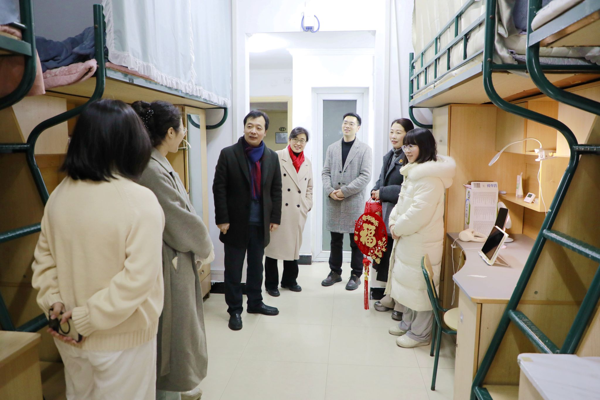 校領(lǐng)導(dǎo)一行先后走訪了留學(xué)生、本科生和研究生寢室,看望留校過春節(jié)的學(xué)生,并與同學(xué)們親切交談,為他們送上新春的美好祝福,囑咐大家注意春節(jié)期間的安全。