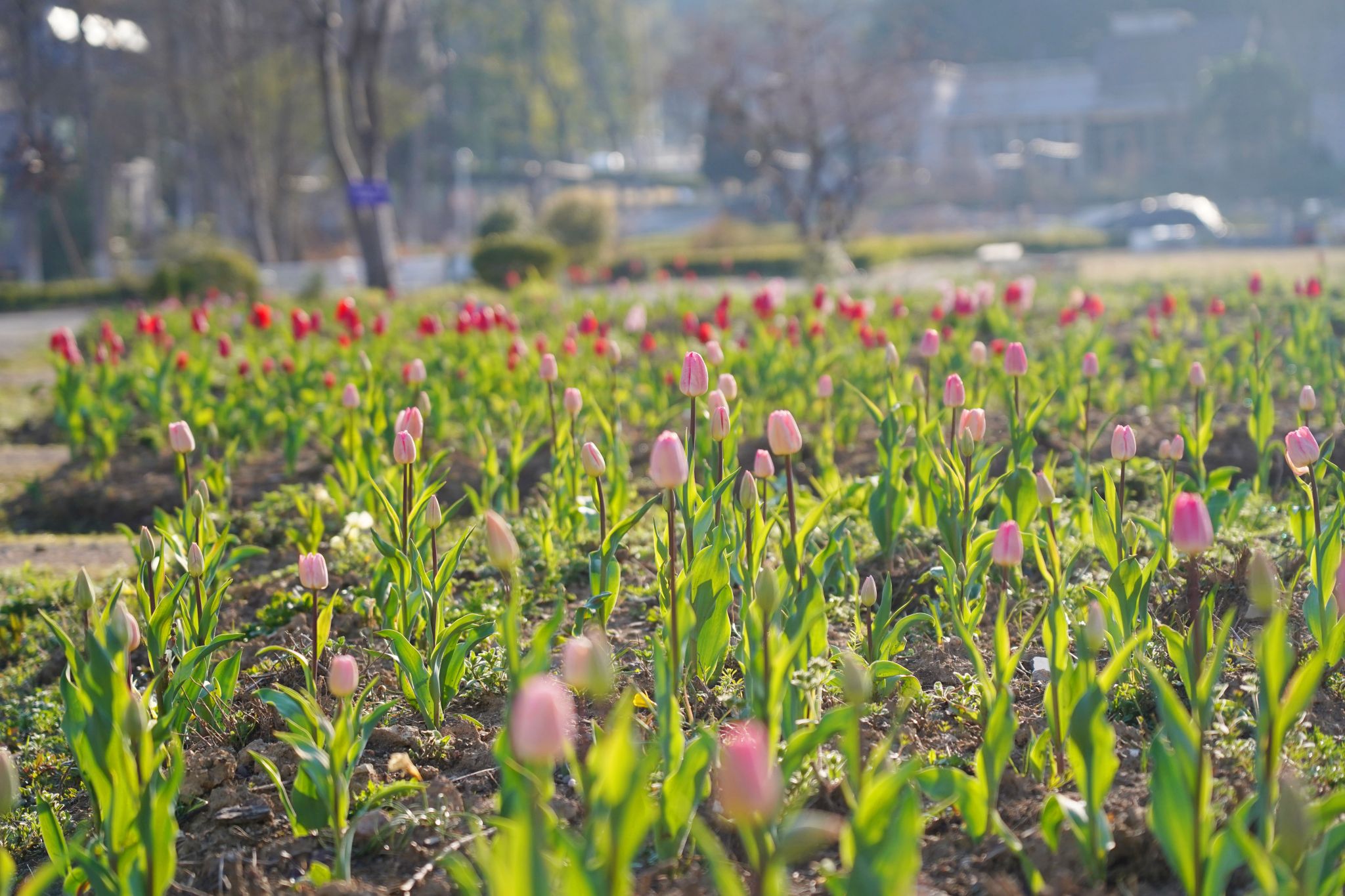 粉白的櫻花 火紅的郁金香 淡雅的繡球競相綻放