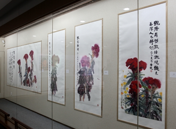 華海鏡,1960年生,浙江寧海人,現(xiàn)為我校美術(shù)研究所所長、藝術(shù)設(shè)計學(xué)院教授、碩士生導(dǎo)師,長期從事中國畫與書法的教學(xué)和科研工作。先后在美國舊金山、北京榮寶齋、珠海博物館和寧波美術(shù)館等地舉辦個人書畫展。此次其展出的作品《黃山圖》恣意縱橫,若行軍布陣,虬騰蒼松,發(fā)人浩氣;《棕櫚》干粗葉壯,恣放揮灑,下端尖毫斑駁凌厲,氣勢撼人;《冠王》雞冠花頂拳拳相靠,傅色明釅,不勝濃艷;《七彩石》系列則更難掩倔強(qiáng)鮮活之氣,紅、黃、藍(lán)等明媚之色落于石上,付之于抽象的強(qiáng)烈主觀心緒。