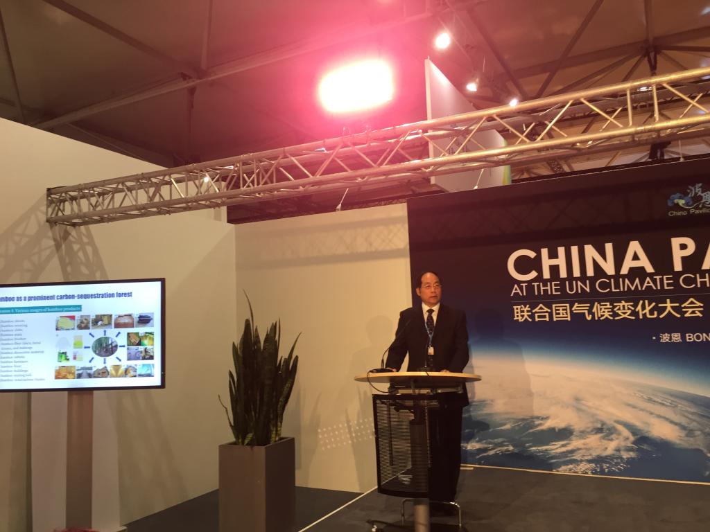 11月8日,在“中國角” 舉辦的“生態服務價值的多元化探索促進綠色低碳發展”的邊會上,周國模教授作了題為System Thinking Bamboo for Climate Change Mitigation, Green Development and Sustainable Communities的學術報告,向來自世界各地的代表介紹了竹林生態系統強大的固碳能力及其在推進綠色經濟、促進社區發展方面的作用。