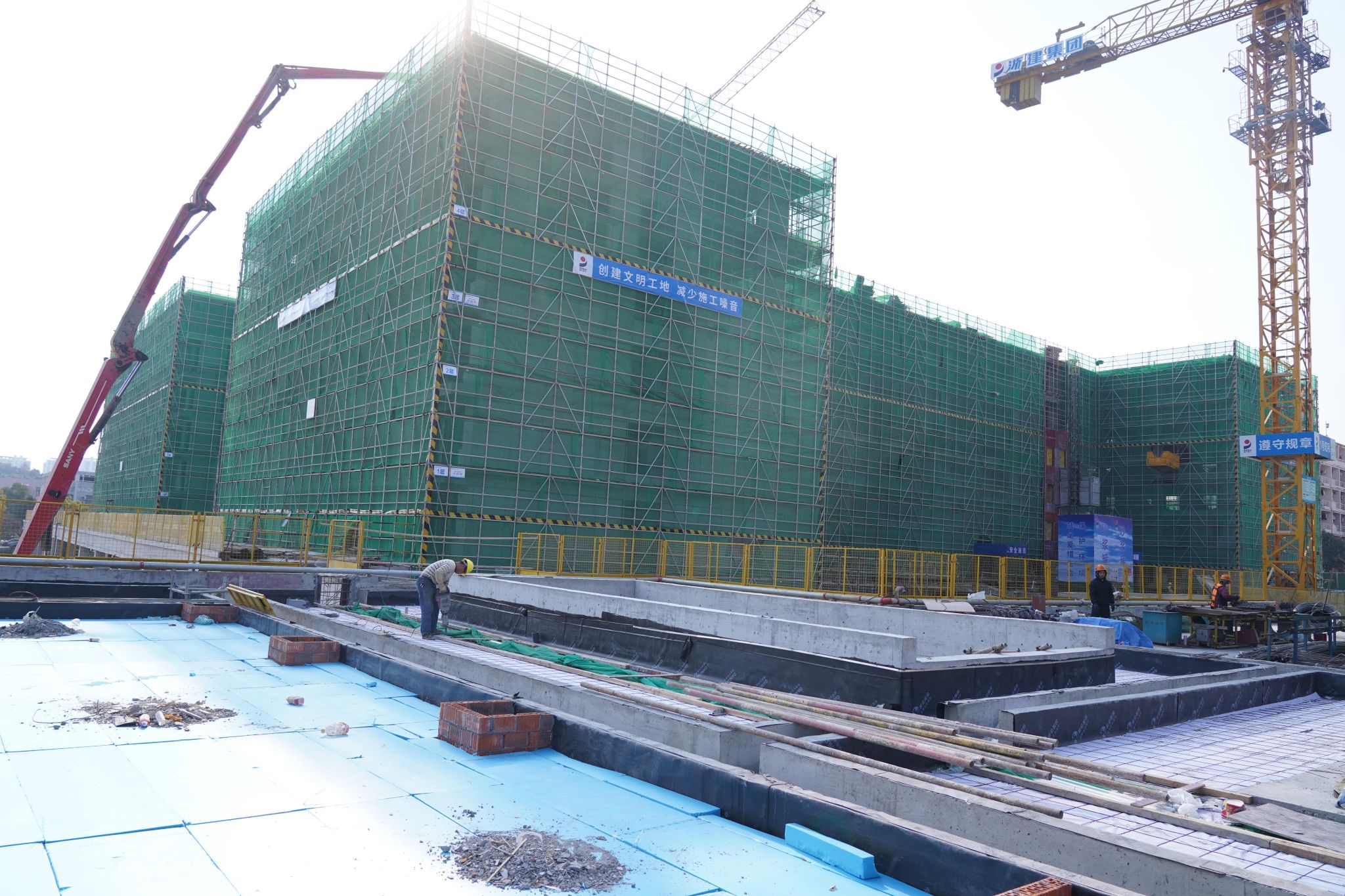 塔吊、臂架式混凝土泵車、升降機幾乎不間斷的向快結頂的幾幢建筑樓上方運輸材料,近百名工人忙碌穿梭其間……盡管在校生們已放寒假,但本該日漸冷清的浙江農林大學校園里,依然熱火朝天。