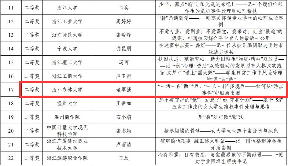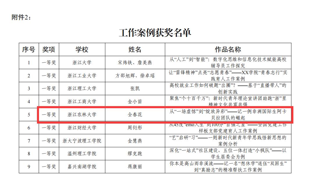 國教學(xué)院全春花的作品《從“一場虛驚”到“綻放異彩”——記一例非洲國際生阿卡貝拉團(tuán)隊的崛起》獲得工作案例一等獎,環(huán)資學(xué)院董軍強(qiáng)的作品《“一污一白”兩世界,“一人一轉(zhuǎn)”多境界——如何從“污點事件”中破局出圈》獲得個人案例二等獎。