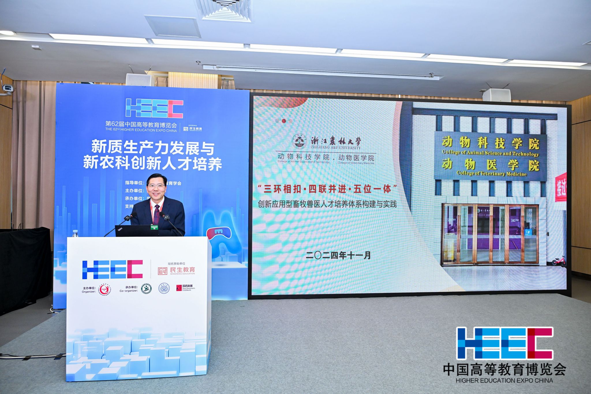 11月15日-17日,由中國高等教育學(xué)會主辦,重慶市教育委員會、重慶大學(xué)、國藥勵展展覽有限責(zé)任公司承辦的第62屆中國高等教育博覽會(以下簡稱高博會)在重慶國際博覽中心舉行。校黨委委員、動科動醫(yī)學(xué)院院長宋厚輝,動科動醫(yī)學(xué)院黨委書記魏玲玲分別應(yīng)邀出席新質(zhì)生產(chǎn)力發(fā)展與新農(nóng)科創(chuàng)新人才培養(yǎng)論壇和第五屆數(shù)字時代創(chuàng)新創(chuàng)業(yè)教育研討會。