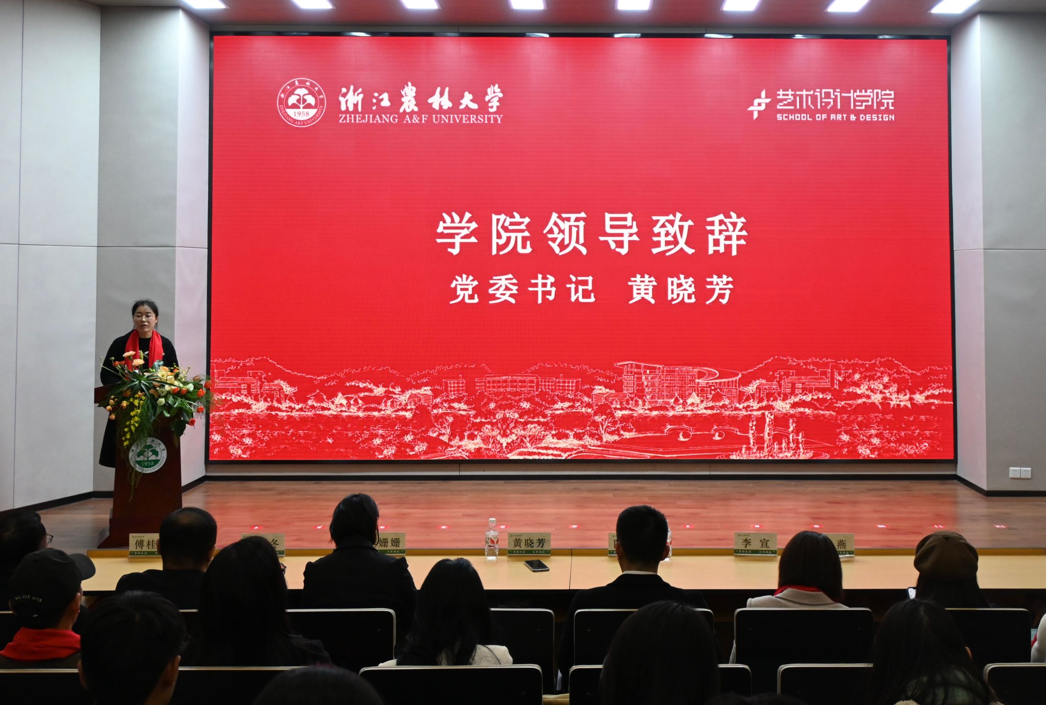 黃曉芳致辭,她代表藝術學院黨政領導班子向全體師生表示誠摯的感謝和崇高的敬意。她表示,2024年藝術學院始終堅持立德樹人根本任務,秉承“崇德尚藝”院訓,在黨建引領、學科建設、學生培養、學院氛圍等方面取到新成績,新突破。2025年,希望全院師生以黨建引領為核心,突出黨管人才,實現數量質量雙飛躍,為藝術學院高質量發展提供堅強人才保障。以品牌建設為指引,聚焦黨建與業務深度融合,推進“雙創”建設力度。以招生就業為抓手,把好人才培養“進口關”和“出口關”,全面提升學生綜合素養。以社會服務為引擎,聚焦藝術賦能美麗鄉建和設計賦能產業升級,開辟產教研深度融合新通道,有效提升藝術學院社會影響力。以藝術樓啟用為契機,有效拓展辦學空間,爭取更多社會資源,把藝術樓打造成公共美育教育基地。