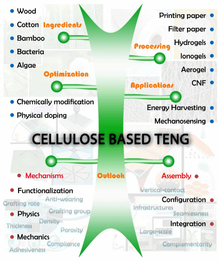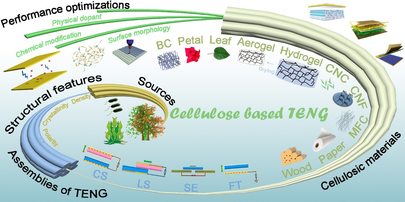 該綜述論文全面總結了近年來基于摩擦納米發電效應的纖維素基機械感受和能量存儲器件(Cellulosic materials for sustainable mechanosensing and energyharvesting devices)的研究進展和展望,系統提供了目前主流的纖維素基納米摩擦電器件匯編,涵蓋了從組成和加工到優化和應用的各方面研究(圖1),重點闡釋了基于摩擦電效應的新型纖維素基離電智能材料的內在作用機制和性能提升策略。